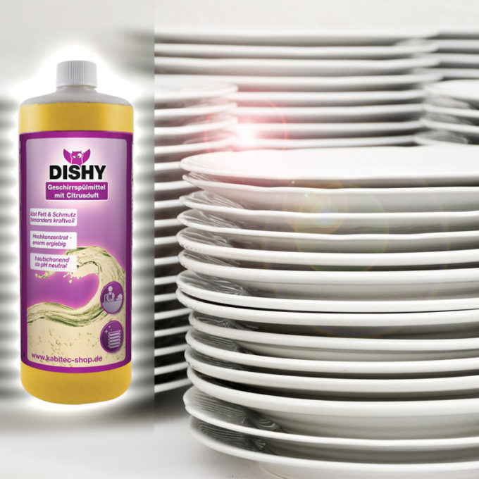 3 ml DISHY in 5 Liter warmes Wasser geben. Die Reinigung des Spülgutes erfolgt mittels Tuch, Schwamm oder Bürste.