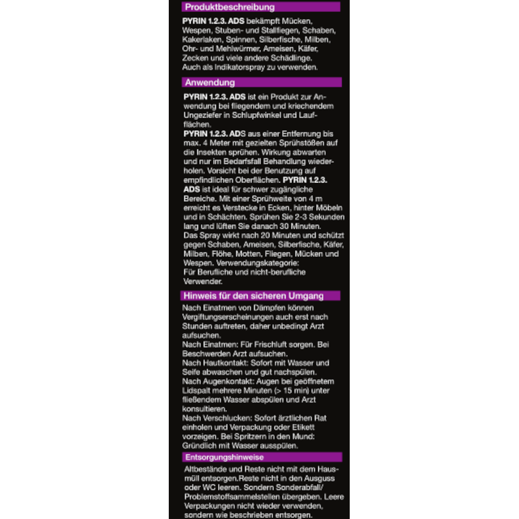 PYRIN 1.2.3. ADS ist ein Produkt zur Anwendung bei fliegendem und kriechendem Ungeziefer in Schlupfwinkel und Laufflächen. PYRIN 1.2.3. ADS aus einer Entfernung bis max. 4 Meter mit gezielten Sprühstößen auf die Insekten sprühen. Wirkung abwarten und nur im Bedarfsfall Behandlung wiederholen. Vorsicht bei der Benutzung auf empfindlichen Oberflächen. PYRIN 1.2.3. ADS ist ideal für schwer zugängliche Bereiche. Mit einer Sprühweite von 4 m erreicht es Verstecke in Ecken, hinter Möbeln und in Schächten. Sprühen Sie 2-3 Sekunden lang und lüften Sie danach 30 Minuten. Das Spray wirkt nach 20 Minuten und schützt gegen Schaben, Ameisen, Silberfische, Käfer, Milben, Flöhe, Motten, Fliegen, Mücken und Wespen. Verwendungskategorie: Für Berufliche und nicht-berufliche Verwender.